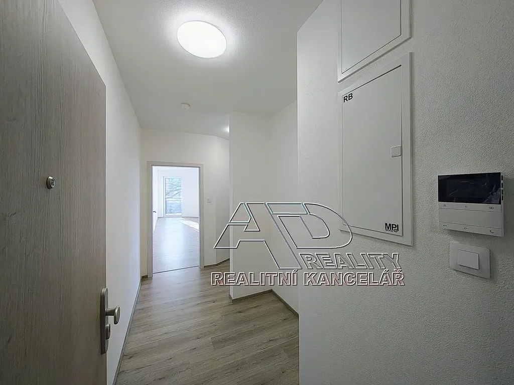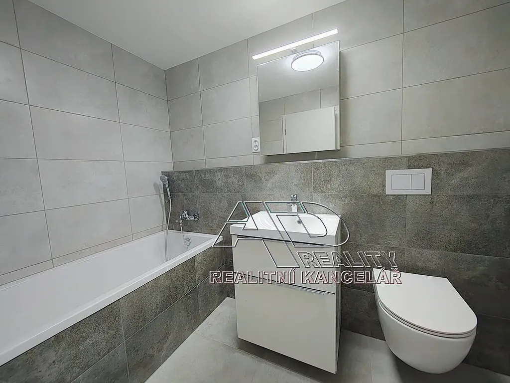 Byt je dokončený ledn_2026 (dosud nebydlená novostavba). Podlahy plovoucí laminátové / vinyl a keramická dlažba, v koupelně vana, závěsné WC. Přípojka pračky je umístěná v předsíni.
