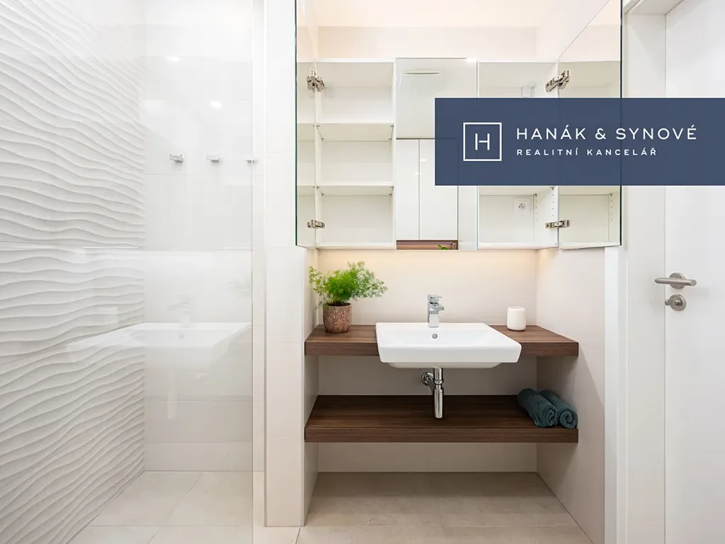 Byt je zařízený ve vysokém standardu a je nabízen plně zařízený – kuchyňská linka se spotřebiči (varná deska, trouba, vestavěná lednice s mrazákem, pračka se sušičkou), vestavěná skříň, postel, židle, pracovní stůl, venkovní žaluzie. Koupelna je vybavena walk-in sprchovým koutem se skleněnou zástěnou značky HÜPPE, záchodem a umyvadlem s umyvadlovou skříňkou, podsvíceným zrcadlem.