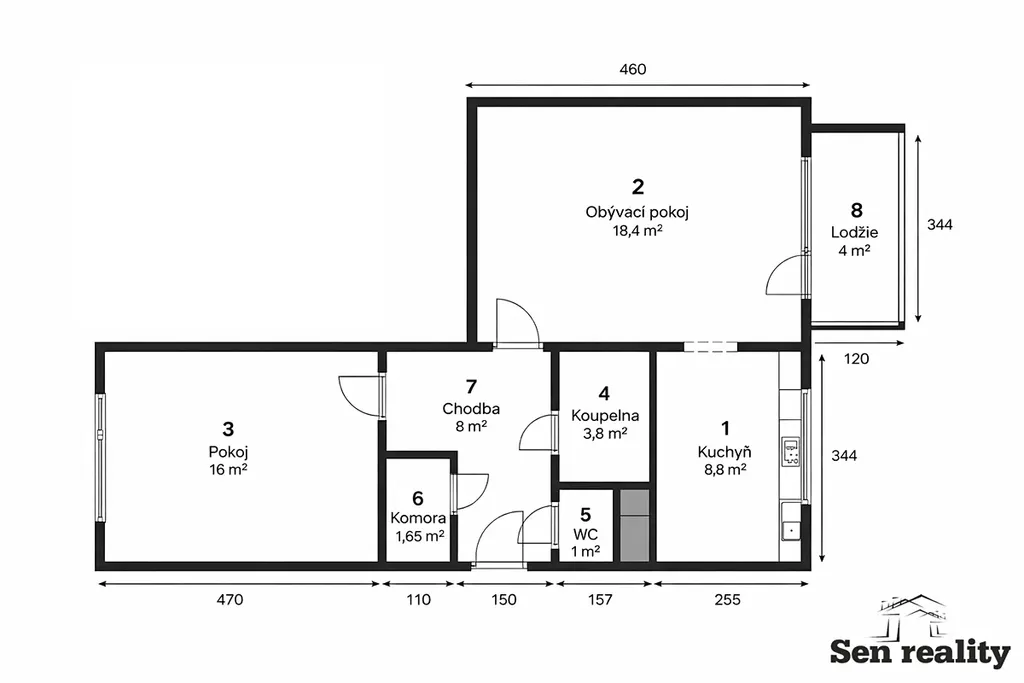 Dispozici bytu tvoří obývací pokoj se vstupem na lodžii, neprůchozí ložnice, kuchyň, koupelna s prostorným sprchovým koutem, samostatné WC, vstupní chodba, komora. Součástí bytu je sklepní kóje v suterénu domu o výměře 2 m2.