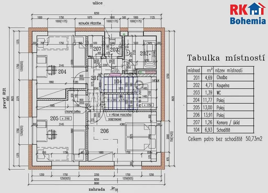 - Patro: Tři prosvětlené ložnice, rodinná koupelna s vanou, samostatné WC s bidetovou sprškou, komora a chodba s přístupem na pochozí půdu.