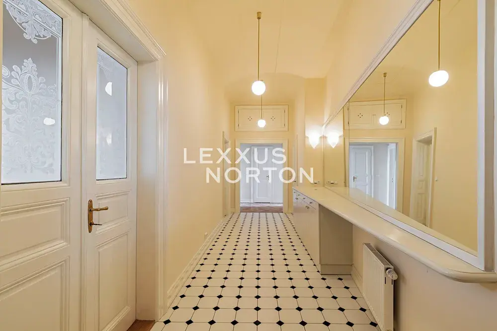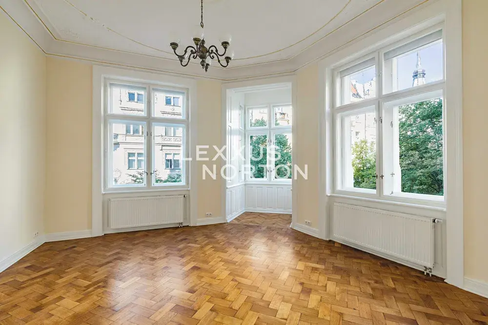 Nabízíme k pronájmu nezařízený luxusní byt 4+1 o velikosti 151 m2 a dvěma balkony, který se nachází ve 3.NP bytového domu s recepcí. Nemovitost disponuje vstupní halou, obývacím pokojem (34 m2) s arkýřem, historickou stropní malbou a vstupem na balkon, kuchyní, jídelnou se vstupem na druhý balkon a do komory, třemi ložnicemi (26 m2, 24 m2 a 18 m2), koupelnou a samostatnou toaletou.