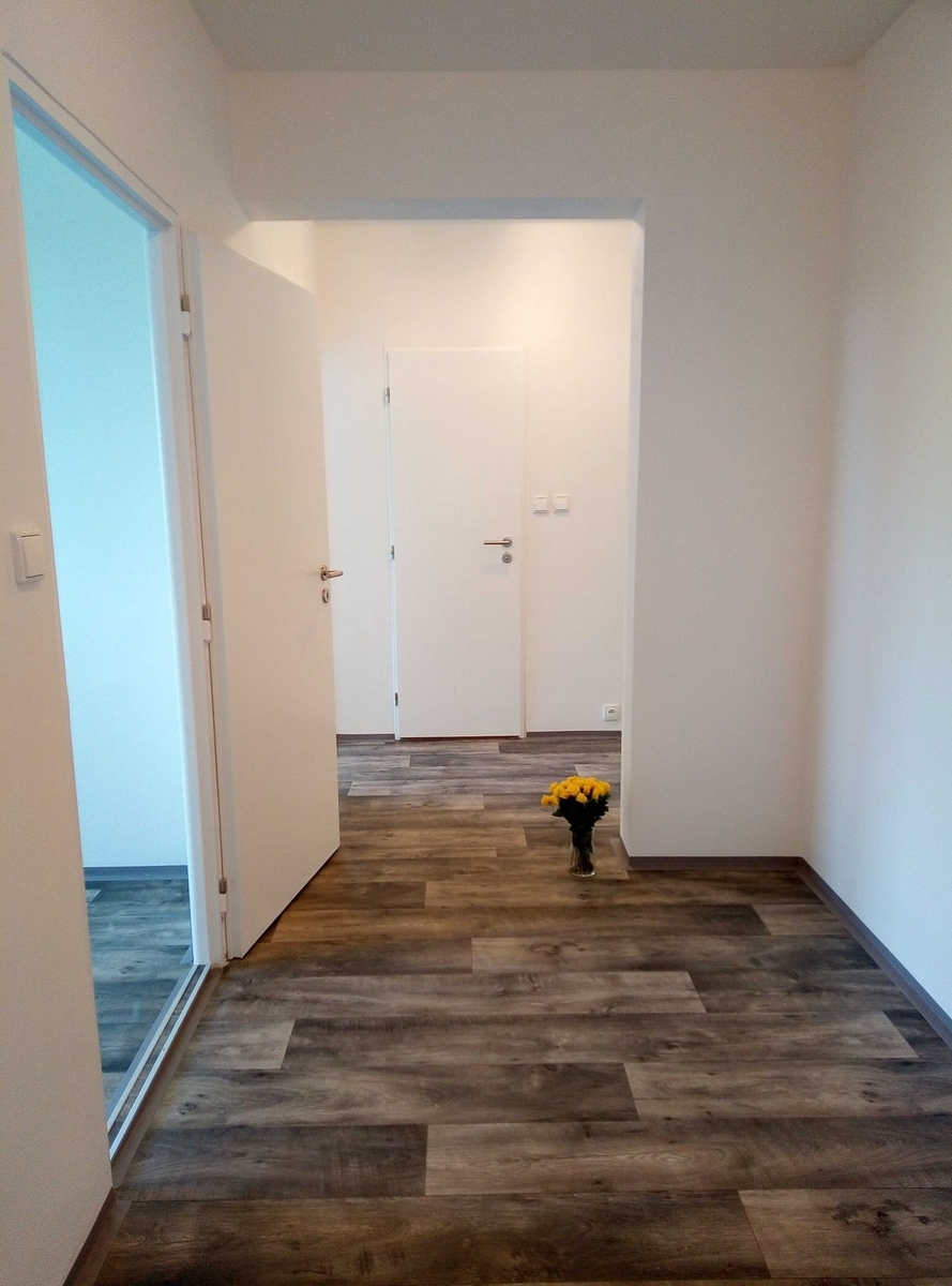 Byt prošel kompletní rekonstrukci v roce 2019 a nachází se v 2. patře z 11.podlažního panelového domu. Byt má vyzděné jádro, podlahy (PVC), rozvody, omítky, interiérové dveře. Koupelna s vanou a umyvadlem s možností připojení pračky, toaleta je odděleně. Kuchyňská linka je opatřena plynovým sporákem a elektrickou troubou. Vstup do komory je z kuchyně. V komoře může být umístěna myčka nebo pračka jsou zde připraveny rozvody.
