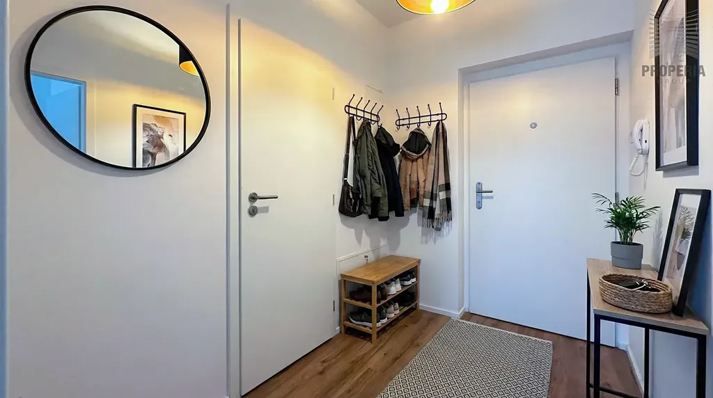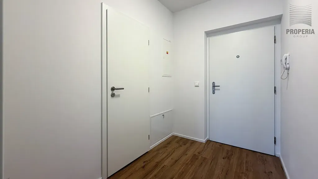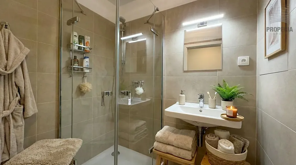 Koupelna je vybavena sprchovým koutem a závěsným WC. Komfort bydlení doplňuje podlahové vytápění a kvalitní sanitární vybavení. Součástí bytu je také sklepní kóje. Optický internet je k dispozici.