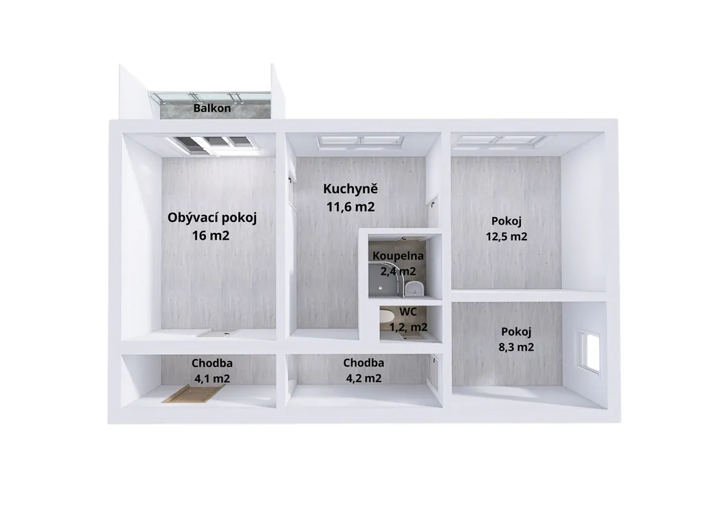 Byt disponuje třemi obytnými pokoji, samostatnou kuchyní, kterou si můžete dodělat dle svých představ, koupelnou a odděleným WC. Součástí je také balkon a sklepní kóje v suterénu domu.