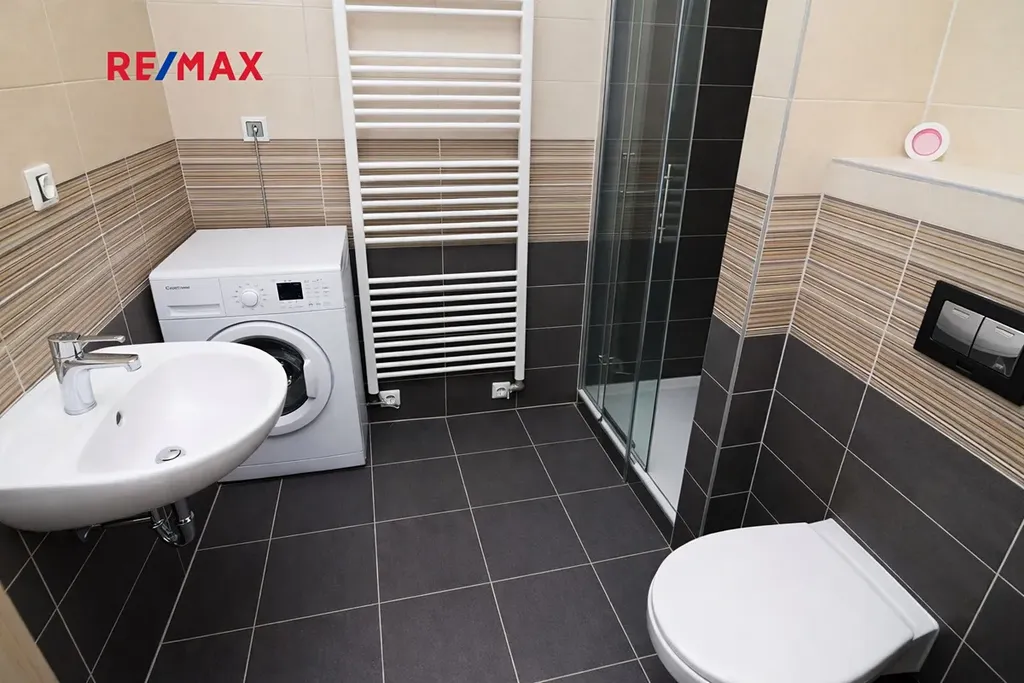 Koupelna se sprchovým koutem, umyvadlem, pračkou a WC.