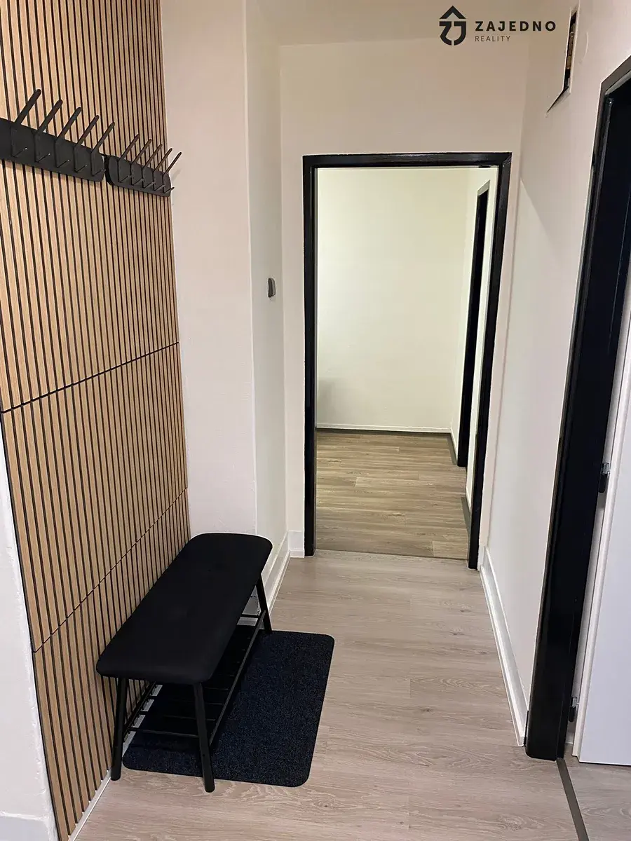 Při vstupu do bytu se nachází předsíň s úložnými skříněmi. Z předsíně je vstup do spíže, koupelny, samostatné toalety a dále do obývacího pokoje s lodžií.
