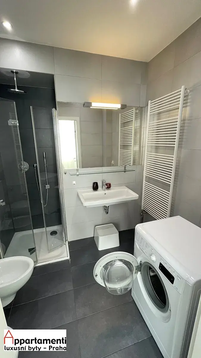 Pronájem krásně a citlivě zrekonstruovaného bytu v roce 2012 za použití kvalitních materiálů. Dispozice 3+kk 86,5m2, byt je uspořádán předsíň s vestavěnou skříní a plynovým kotlem o velikosti 7,4m2, velký zařízený obývací pokoj s kuchyňským koutem 44,8m2, ložnice 10m2, druhá ložnice 16m2, 2x koupelna s vanou a WC ,další se sprchovým koutem WC a bidetem 4,7m2 a 3,6m2, pracovna (šatnakomora) s oknem. Interiér bytu je realizován v moderním nadstandardním provedení s použitím materiálů od předních italských výrobců jako jsou Ceramica, Catalano, Zucchetti Tre Piu. Při návrhu a realizaci byl kladen důraz především na čistý design a kvalitu provedení. Vysoké bez zárubňové dveře. Kvalitní dřevěná podlaha. Italské designové baterie. Závěsný bidet a WC v koupelnách, Moderní umyvadla. iPad napojený na kamerový systém. Nový výtah v domě. Designová řada vypínačů Swing ABB . Velká okna, ideální pro rodinu s dětmi, nebo pro studenty.