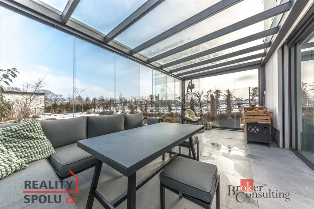 Dominantou domu je prostorný obývací pokoj s kuchyňským koutem a jídelní částí, který je díky velkoformátovým oknům krásně prosvětlený a má přímý vstup na krytou terasu. Terasa je zastřešena kvalitní hliníkovou pergolou s prosklením, umožňující komfortní využití po celý rok, a plynule navazuje na zahradu.