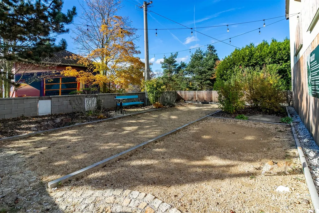Venkovní prostory zahrnují místo pro posezení, petanqová hřiště a vzadu prostor pro vjezd zásobování.