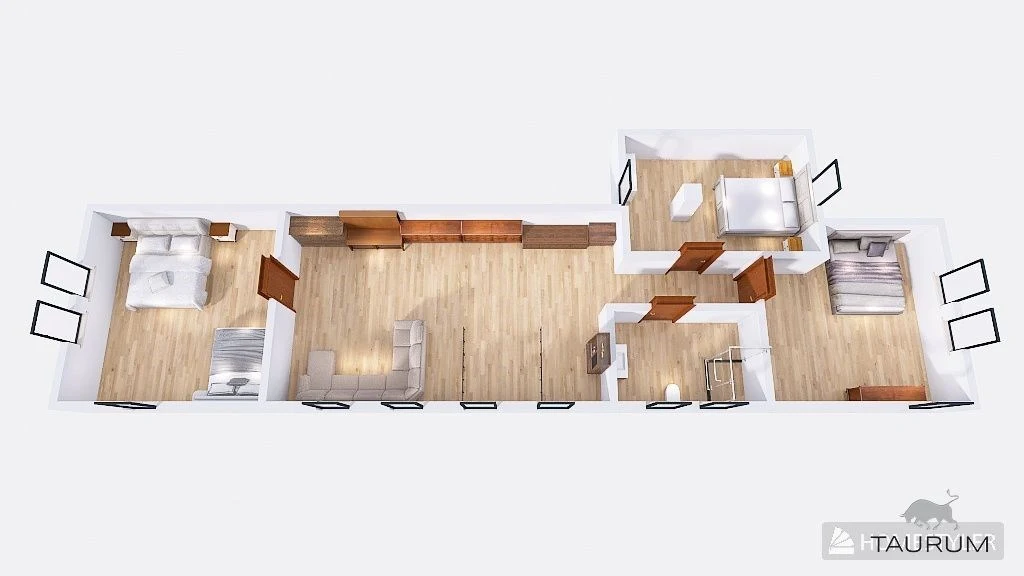 V patře jsou tři ložnice, obývací prostor a koupelna s toaletou.