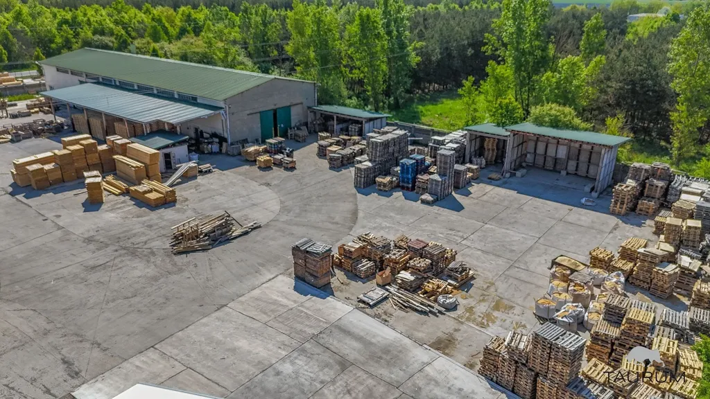 Dále jsou na pozemku přístřešky tmavě zelené plochy na fotce z dronu. Před vjezdem do hlavního pozemku jsou na levé i pravé straně samostatné oplocené pozemky.
