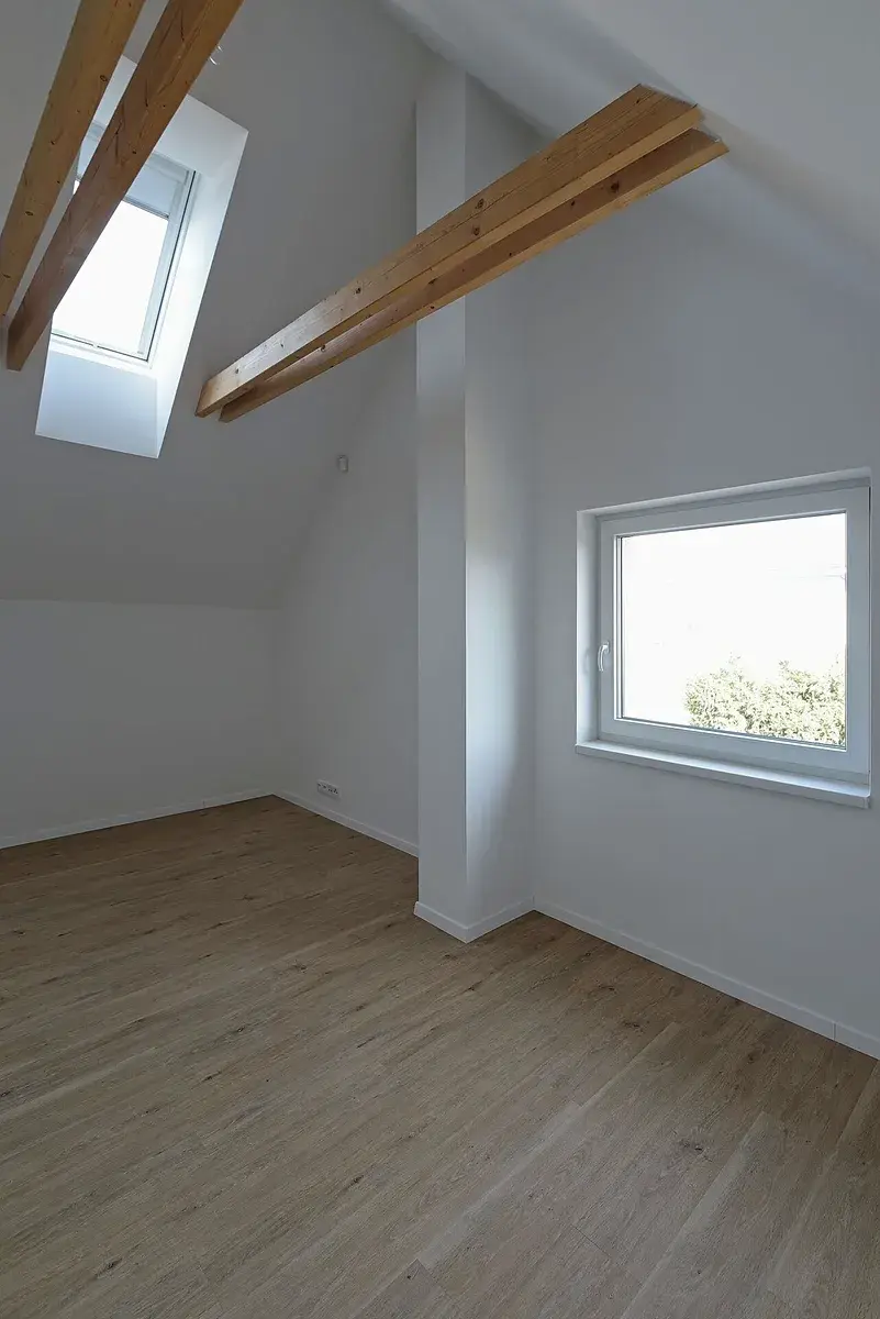 Dům o dvou nadzemních podlažích má zděnou konstrukci se sedlovou střechou. V přízemí najdete velký obývák s jídelním prostorem a plně vybavenou moderní kuchyňskou linkou, hostinský pokoj (pracovnu), koupelnu, WC, technickou místnost a podschodišťový prostor – komoru. V 1. patře jsou pak 3 samostatné pokoje, šatna a druhá koupelna s WC. V podkroví jsou pak k dispozici úložné prostory (pochozí v celé své ploše). Na dům navazuje prostorná dvojgaráž se zahradním skladem. Umístění domu na pozemku a absence oken sousedního domu orientovaných do zahrady skýtá výjimečné soukromí – na zahradu ani do obytných místností není prakticky od nikud vidět.