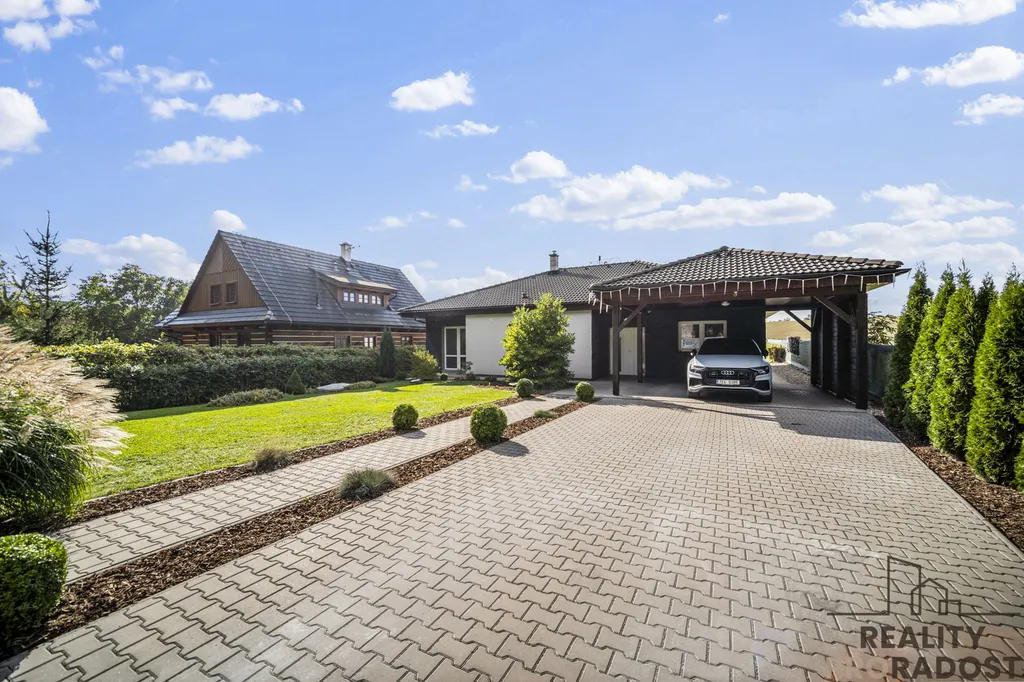Před domem se nachází parkovací místo a zastřešený přístřešek, díky kterému lze parkovat pod střechou a vstupovat do domu suchou nohou. Vjezdová brána je na dálkové ovládání.