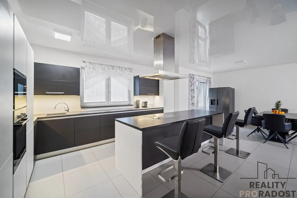 Levá část domu nabízí kuchyni propojenou s prostorným obývacím pokojem, který tvoří hlavní obytný prostor domu a místo pro setkávání rodiny. Z obývacího pokoje je přímý vstup na velkou terasu a dále k bazénu.