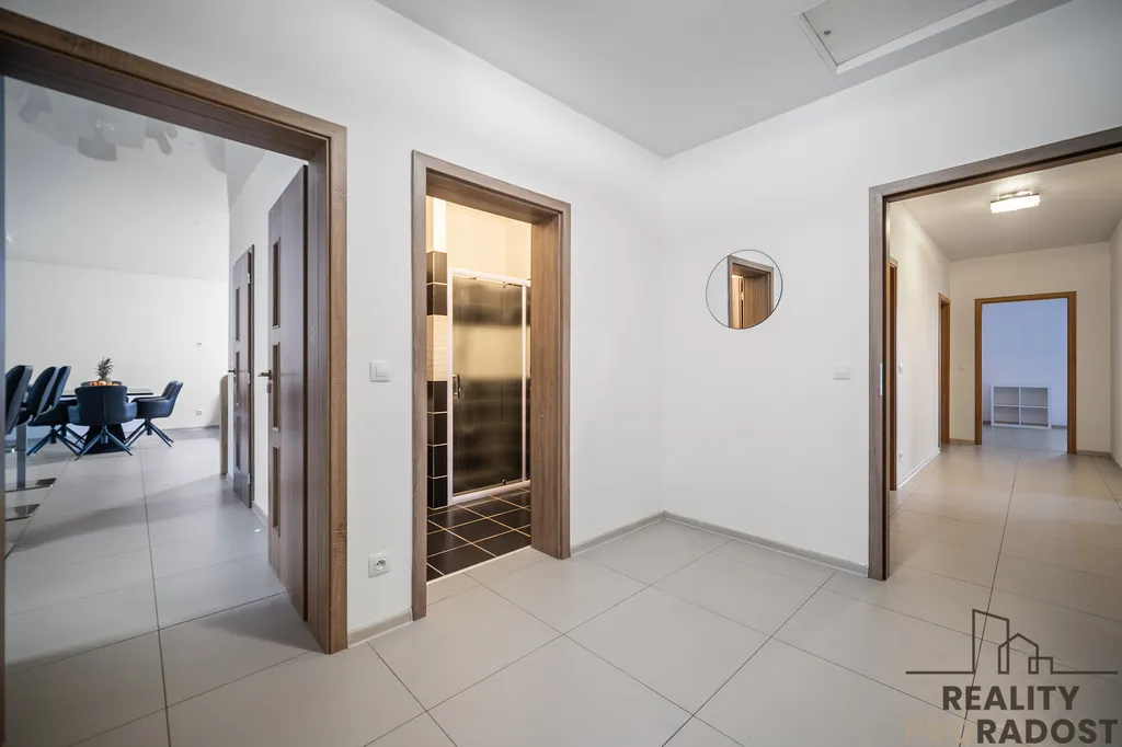 Po vstupu do domu se dostanete do předsíně, na kterou navazuje centrální chodba propojující všechny místnosti.