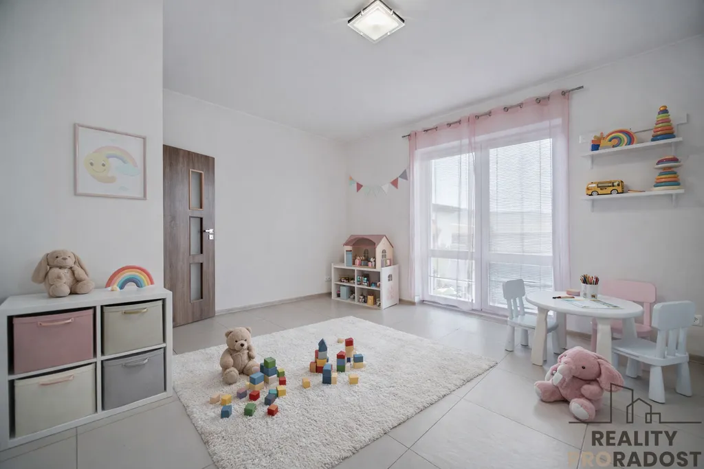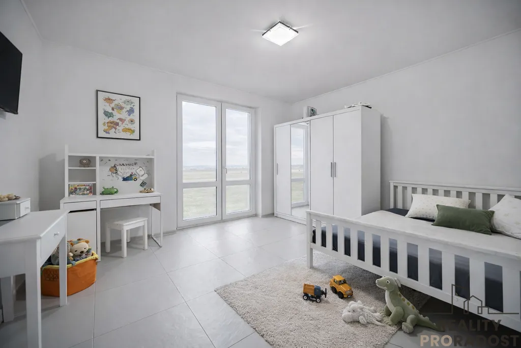 Pravá, klidová část domu zahrnuje pracovnu / kancelář, ložnici, dva dětské pokoje a dvě koupelny – jednu s vanou a druhou se sprchovým koutem.