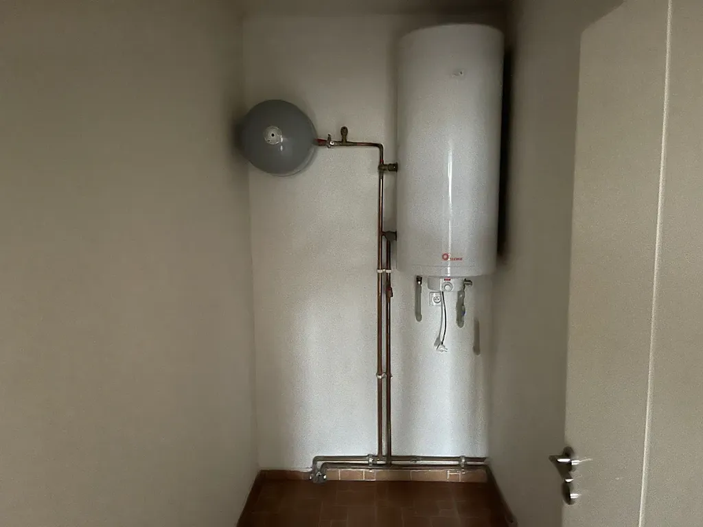 Byt je vytápěn krbovými kamny s výměníkem. Ohřev vody elektrickým bojlerem.