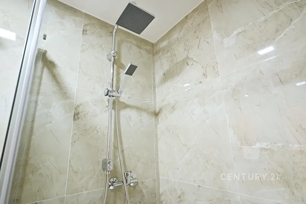 • Stylová koupelna se sprchovým koutem, velkoformátovými obklady se vzorem mramoru, novým sanitárním vybavením, skříňkou pod i nad umyvadlo a WC