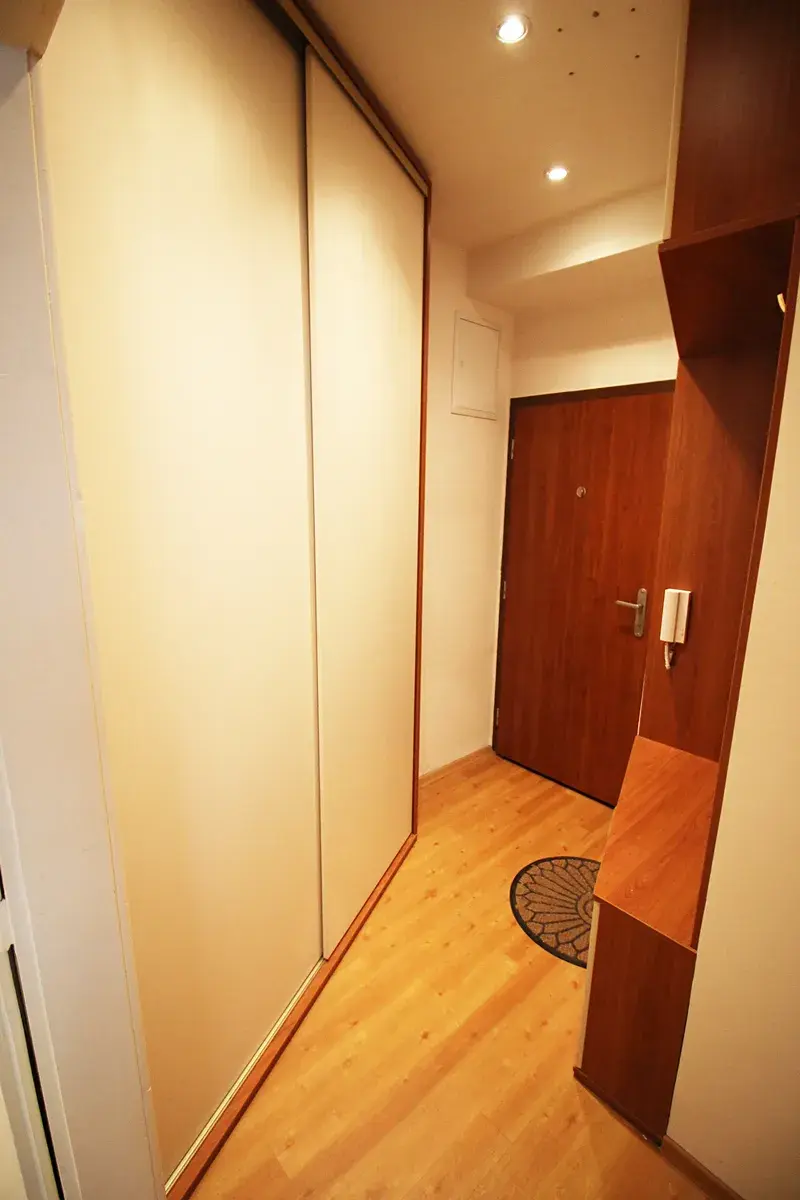 Koupelna je se sprchovým koutem, v předsíni velká vestavná skříň, jinak bez nábytku.