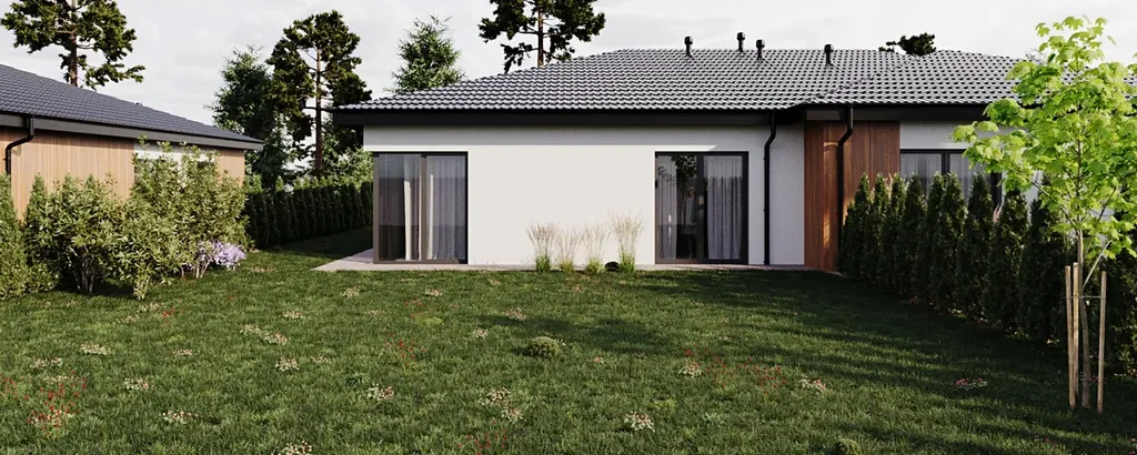 Standardem je tepelné čerpadlo Panasonic,podlahové vytápění,okna s trojskly,italské obklady,příprava na fotovoltaiku a parkování pro dva vozy přímo u domu.