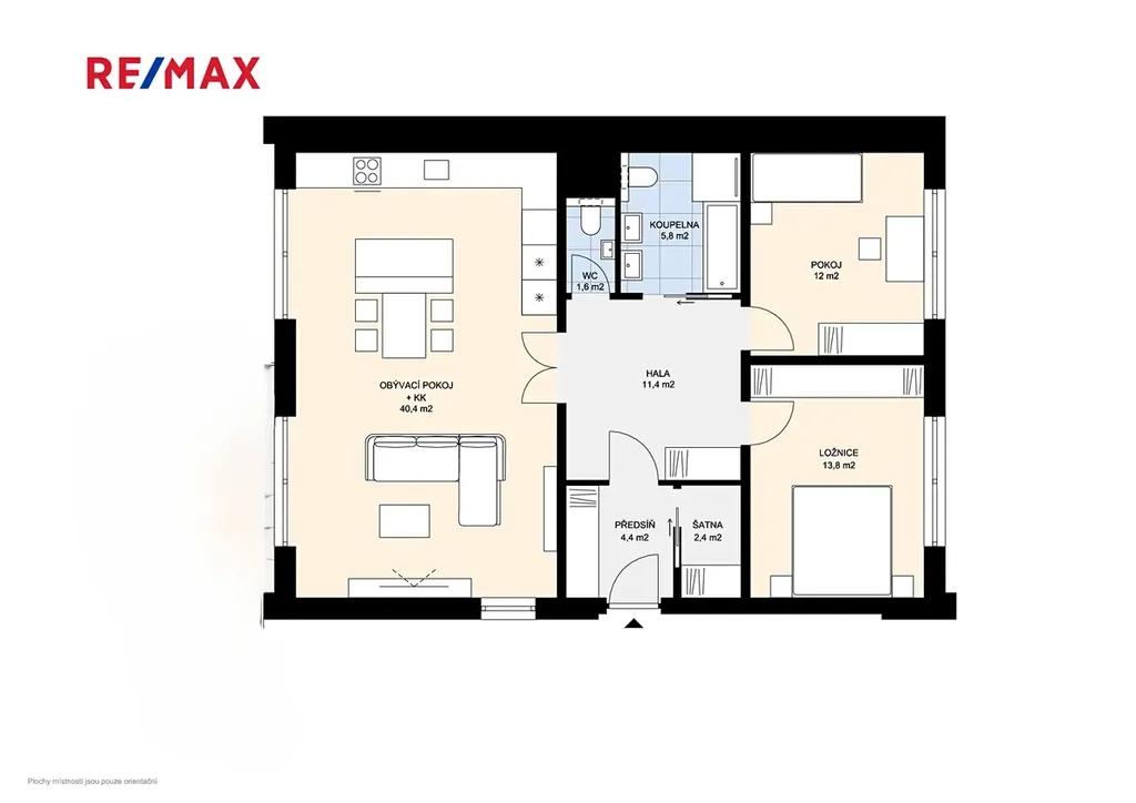 Dispozici tvoří prostorný obývací pokoj s kuchyňským koutem o velikosti 40,4 m², dva samostatné pokoje (13,8 m² a 12,0 m²), hala (11,4 m²), koupelna (5,8 m²), samostatné WC (1,6 m²), šatna (2,4 m²) a chodba (4,4 m²). K bytu náleží také půdní prostor o velikosti cca 20 m², přístupný schodištěm z chodby bytu.