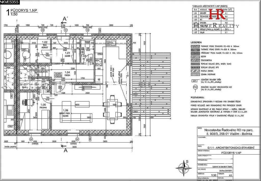 Nabízíme ke koupi novostavbu nízkonákladového řadového rodinného domu v lokalitě Vlašim – Bolinka. Celková výměra pozemku 505 m2. Zastavěná plocha domem 72,2 m2 + terasa 15 m2 a další zpevněné plochy, napojení na IS – elektřina 25 A, vodovod, kanalizace. Uliční přístupová komunikace – obecní asfaltová, přístupová komunikace včetně chodníků – betonová dlažba. Dům není podsklepený. Topení: tepelné čerpadlo vzduch – voda, podlahové vodní vytápění celého domu, boiler. Podlahy – vinylové a dlažba – výborný přenos tepla. Okna plastová – trojsklo. Betonová taška. Dům splňuje nízkoenergetický standard – PENB – třída B. Je postaven za použití kvalitních materiálů. Dispozice domu: 5+kk/terasa. Podlahová plocha domu 104,9 m2. 1. NP – obývací pokoj s kuchyňským koutem 29,5 m2, pracovna 7,1 m2, chodba 4,8 m2, technická místnost 4,4 m2, zádveří 4,1 m2, sklad 2,1 m2, WC s umyvadlem 1,8 m2. 2. NP – ložnice 14,3 m2, 2 dětské pokoje 12,4 m2 a 11,8 m2, koupelna se sprchovým koutem, WC a 2 umyvadlem a vertikálním topným tělesem na sušení ručníků 9,3 m2, chodba 3,3 m2. Rozvody internetu a TV antény – příprava do zásuvky. Oplocení pozemku. Lokalita: Místní část Bolinka cca 1,5 km od Města Vlašim, kde je široká občanská vybavenost – Městský úřad, MŠ, ZŠ, SŠ, lékárna, pošta, obchody, restaurace, autobus a vlak. V místě je autobusová zastávka cca 150 m od pozemků. V případě zájmu vám rádi zajistíme sjednání úvěru, právní servis, úschovu finančních prostředků. Termín dokončení do 31. 12.2024. Podrobnější informace získáte v naší realitní společnosti.