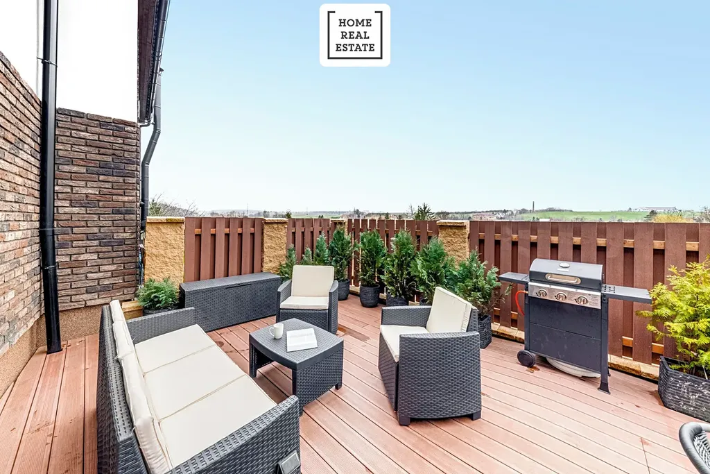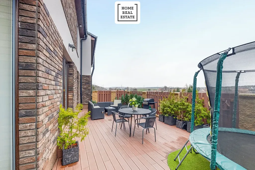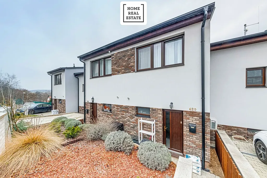 Obývací pokoj s kuchyňským koutem a spižírnou nabízí přímý vstup na terasu se zahrádkou. Master ložnice má vlastní sociální zařízení s WC, sprchovým koutem a umyvadlem. Dům má dále dvě dětské ložnice. Zahrada a terasa poskytují dostatek soukromí a nádherný výhled na hory Říp a Milešovka.