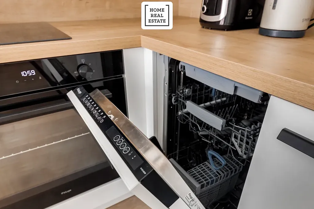 Dispozice bytu zahrnuje obývací pokoj s plně vybaveným kuchyňským koutem (sklokeramická varná deska, digestoř, trouba, myčka, lednice a mikrovlnná trouba), samostatnou ložnici, koupelnu se sprchovým koutem, WC, umyvadlem a pračkou se sušičkou a vstupní předsíň. Interiér je zařízen kvalitním nábytkem na míru. Součástí nabídky je také sklepní kóje, která poskytuje další úložný prostor.