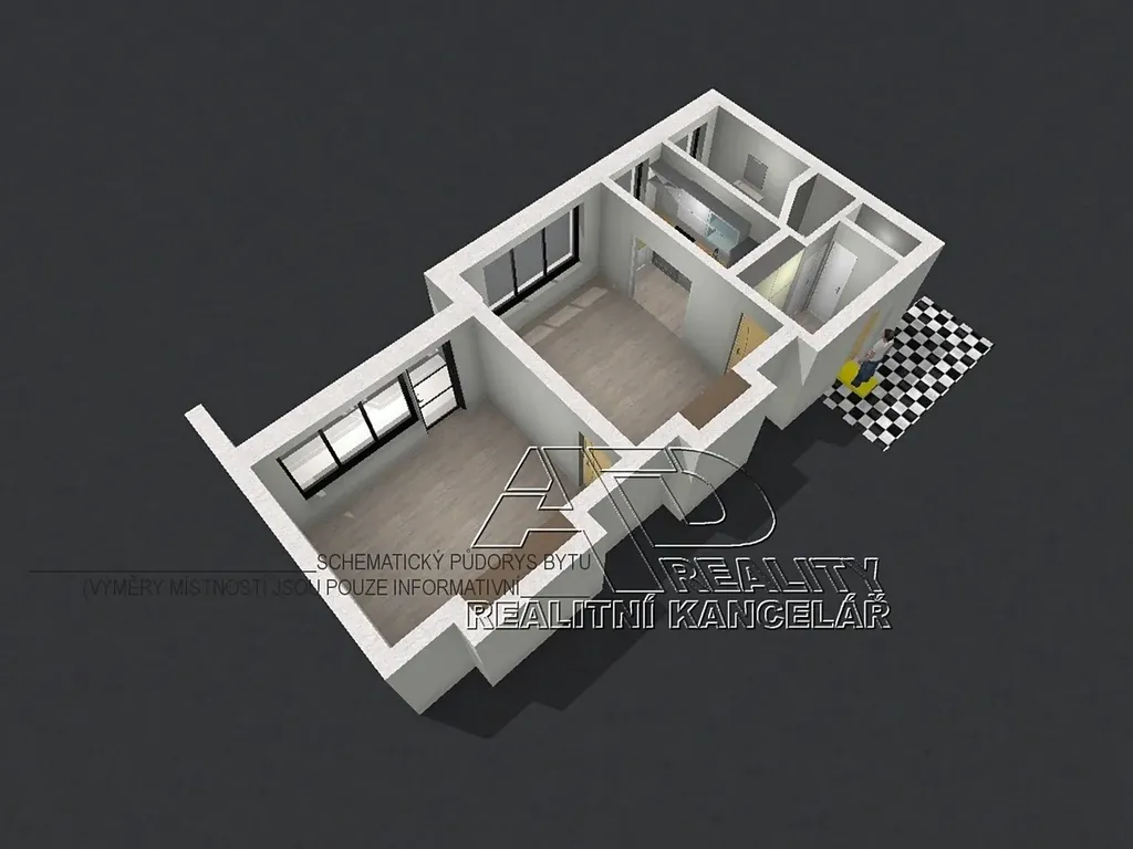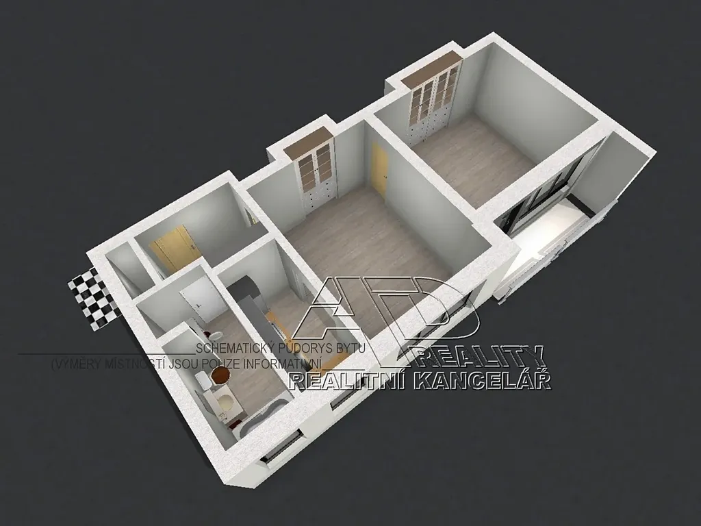 Dispozice bytu: obývací pokoj [16,4m2], kuchyňský kout [4,2m2], pokoj/ložnice [17,4m2] s lodžií [4,3m2], předsíň [4,6m2] a koupelna s WC [5,4m2]. K bytu je k dispozici sklepní kóje v 1.PP (suterén) domu o výměře cca [1,8m2]. Topení v bytě centrální / ústřední dálkové (podlahové), podružné měření spotřeby teplé a studené vody (vodoměry), samostatné měření spotřeby elektřiny (elektroměr). V bytě je možnost připojení internetu a STA.