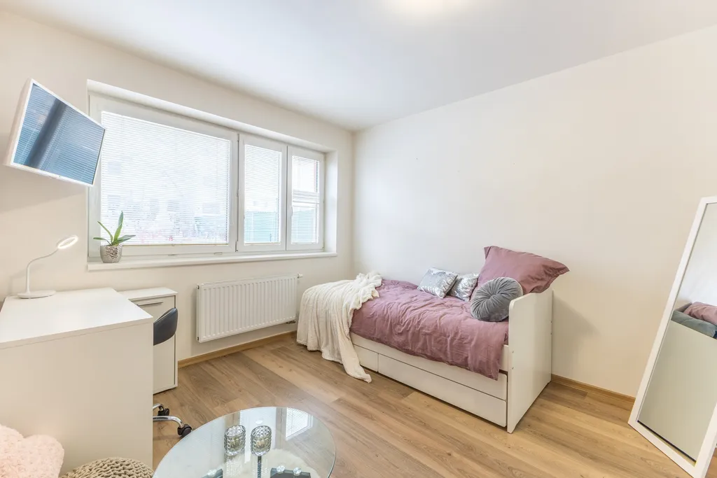 Byt o podlahové ploše 53 m2 nabízí promyšlené dispoziční řešení a skládá se z obývacího prostoru s kuchyňským koutem, samostatné ložnice, koupelny, odděleného WC, předsíně a sklepa. Byt se pronajímá s částečným vybavením a je volný od 1.3.2026. Prohlídky jsou možné už nyní.