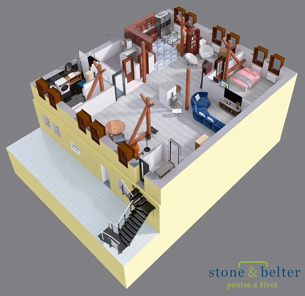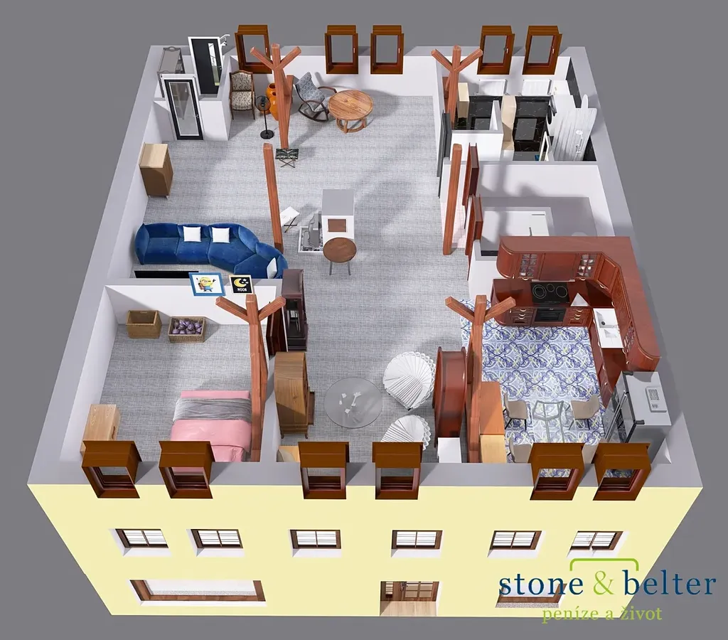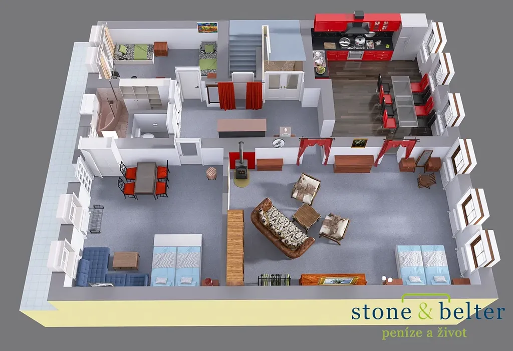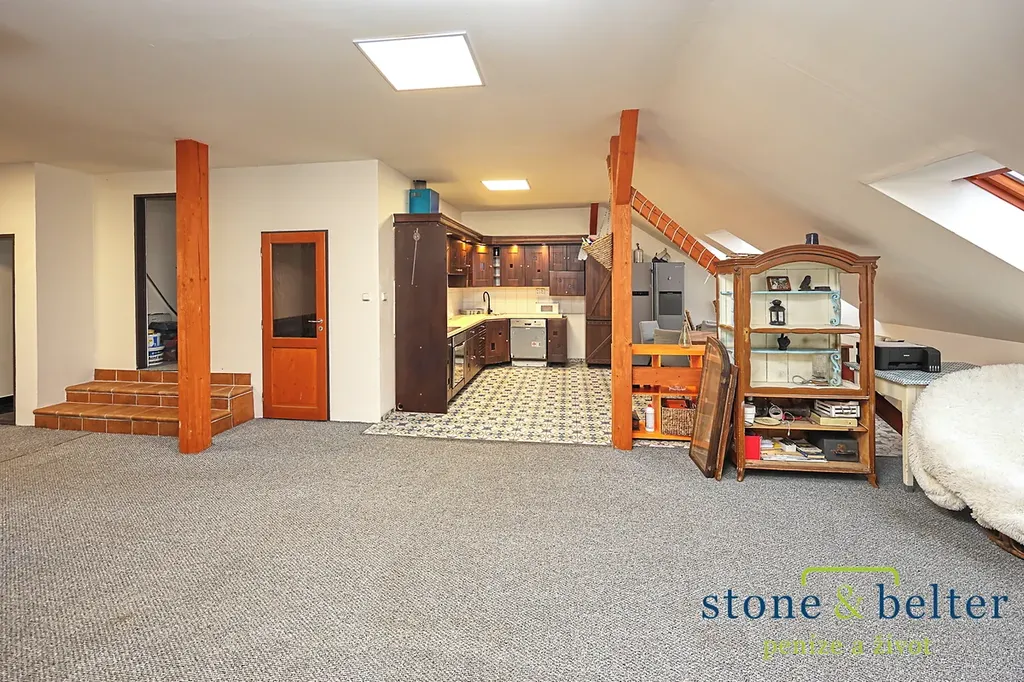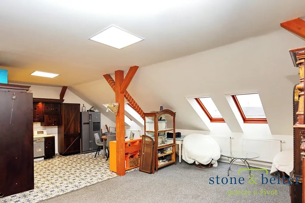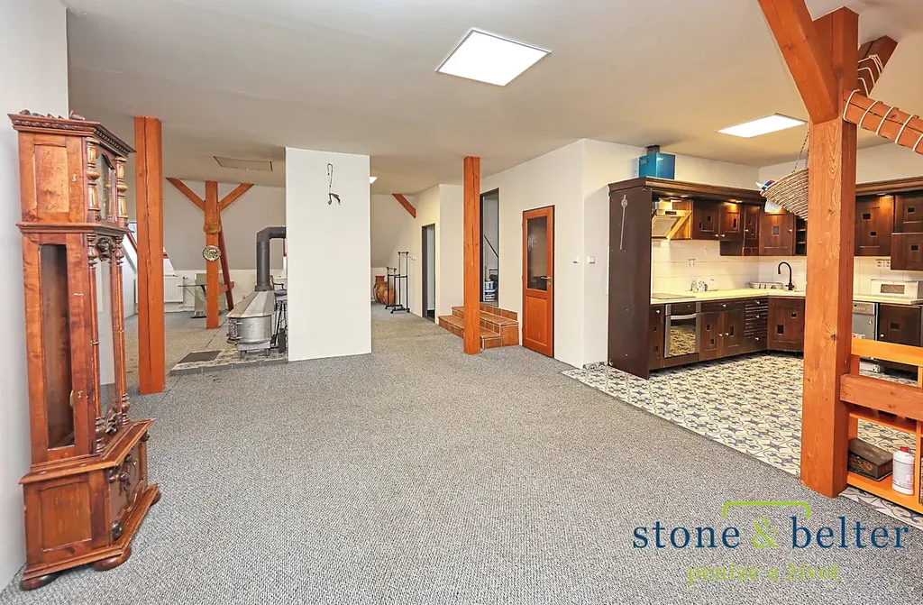- byt 2+kk (obývací pokoj s kuchyňským koutem - 107 m2; ložnice - 18 m2; sklad - 12 m2; šatna - 3 m2; koupelna a WC - 17 m2)