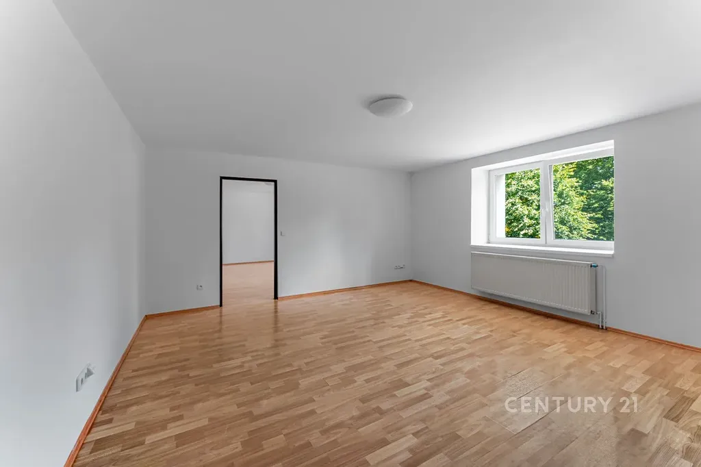 Bytová jednotka: velká ložnice, pokoj, obývací pokoj s kuchyňským koutem, koupelna, WC, spíž a balkon s výhledem.