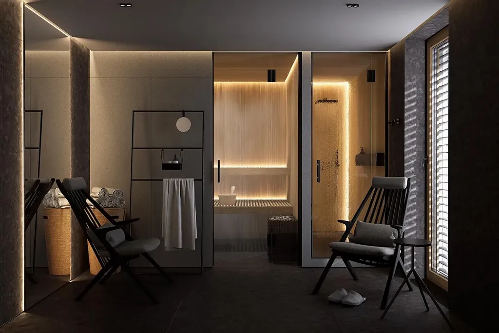 Dům je dispozice 6+kk s bohatým příslušenstvím. Když projdete hlavními dveřmi, ocitnete se v prostorném zádveří, kde je navržena opravdu stylová šatna pro odklad kabátů a obuvi. Ze zádveří je také vstup do koupelny s vanou, wc a také do spíže to aby jste s nákupem nemuseli chodit daleko. Prosklenými dveřmi dále vstoupíte do hlavního sálu této vily – obývacího pokoje. Tady se místem opravdu nešetřilo, je zde dostatek prostoru jak pro kuchyňský kout, tak pro jídelní stůl a také pro odpočinkovou část s krbem. V přízemí se dále nachází pokoj pro hosty, vlastní posilovna a také wellnes pokoj se saunou, ochlazovnou, místem pro relax a vstupem do zahrady.