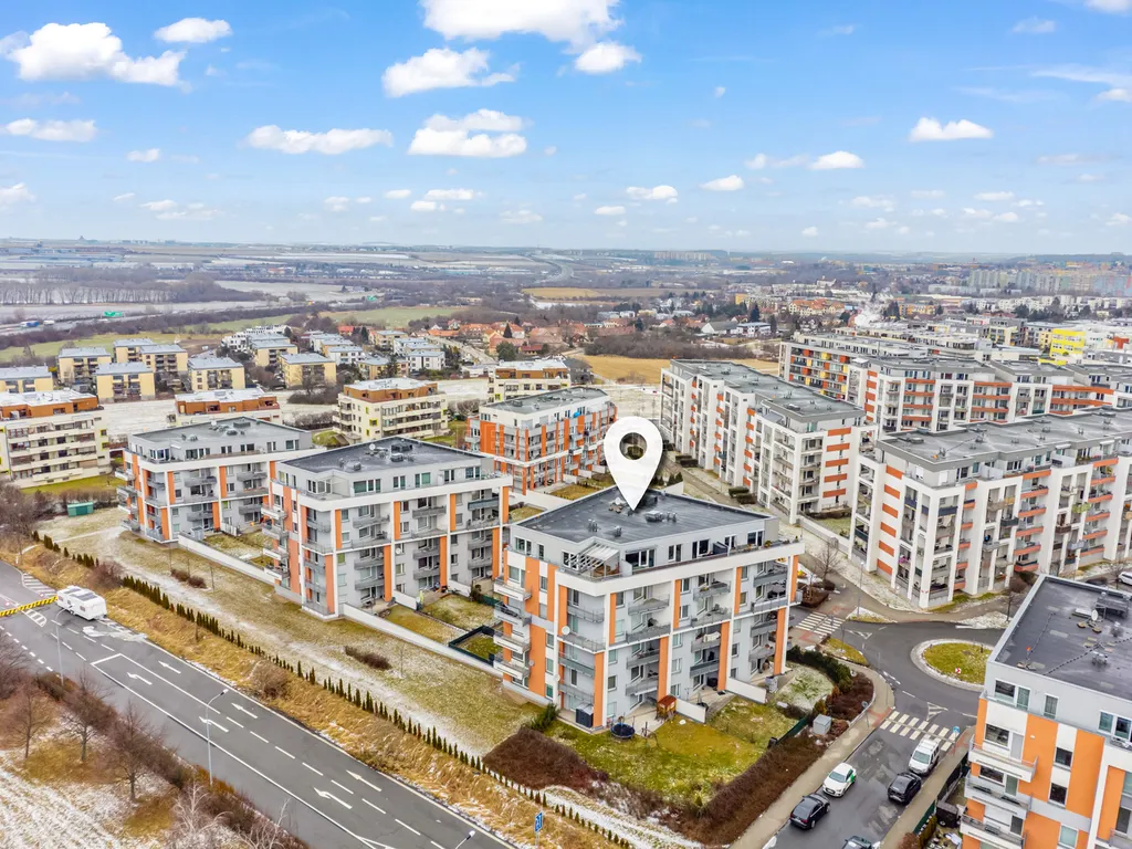 Byt je situován ve 2. nadzemním podlaží moderního domu s výtahem. K bytu náleží parkovací stání v 1. podzemním podlaží, sklepní kóje o velikosti 4,5 m² umístěná hned vedle parkovacího místa a lodžie o ploše 4,8 m², která poskytuje příjemný prostor k relaxaci.