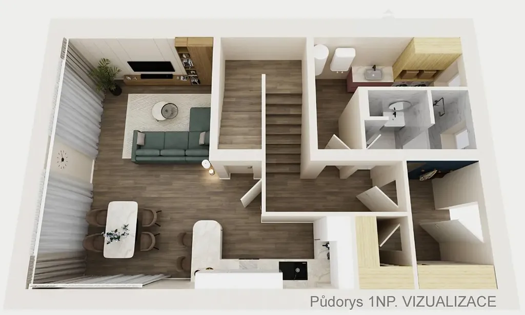 Dispozice je rozdělena do dvou nadzemních podlaží. V přízemí se nachází vstupní zádveří (5,74 m²), šatna (2,21 m²) a chodba (4,55 m²). Dále koupelna (4,54 m²), technická místnost (8,16 m²), kuchyně (7,79 m²) a dominantní obytný prostor (27,93 m²) s přímým vstupem na terasu a zahradu – přesně ten typ prostoru, který dnes z novostaveb mizí jako první.