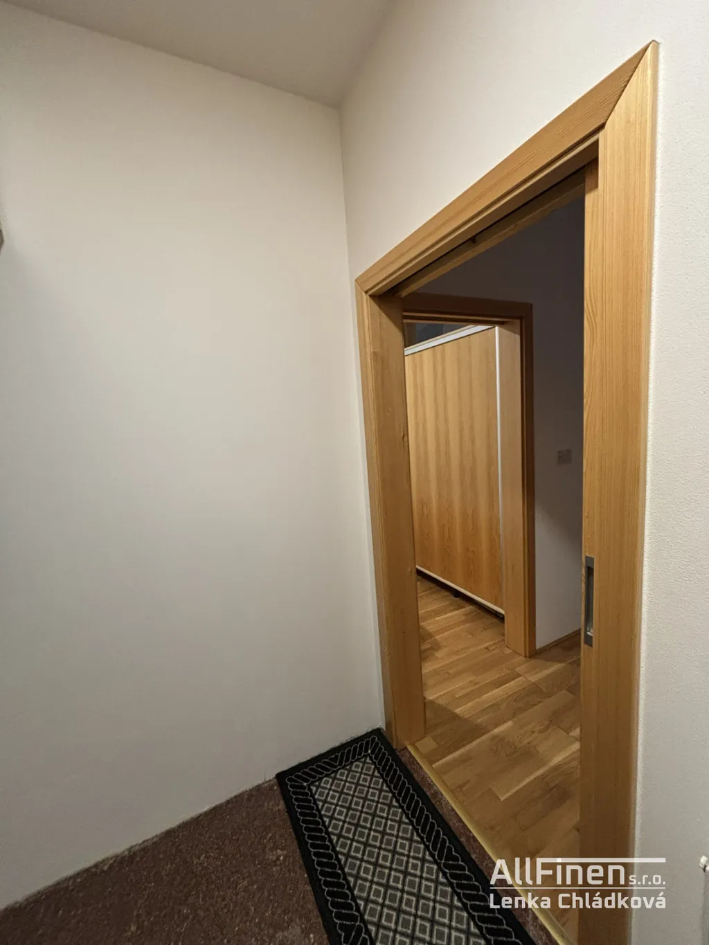 V chodbě je praktická věšáková stěna, pračka AEG a sušička Elektrolux.