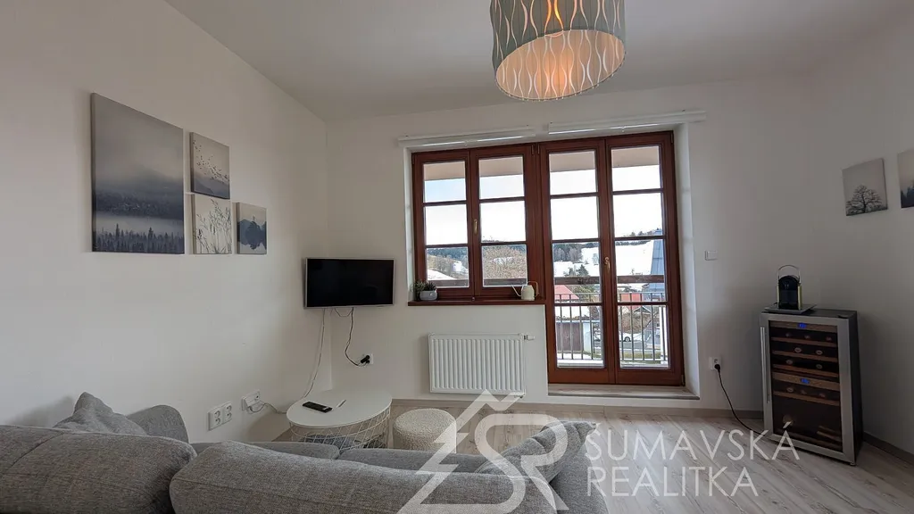 Popis: klasicky zděný bytový dům o 13 bytech byl realizovaný podle kvalitního autorského projektu arch. Radima Hucla. Je vybavený výtahem, v krásné poloze s výhledem na šumavská panoramata v jižně orientovaném pozemku, cca 2 min. pěší chůze od náměstí. Součástí bytu je i venkovní parkovacího stání. Komfortní byt je vybaven kvalitními standardy a výhodou je jižní balkón. Dům je připojen na městskou výtopnu biomasou, byt má samostatné měření tepla, vody a elektřiny. Jedná se o byt ve 2. NP o dispozici 2+kk a podlahové ploše 47 m². Z chodby vybavené skříní a botníkem jsou vstupy do prostorného a prosvětleného obývacího pokuje s velkou kuchyňskou linkou, jídelním stolem a sedací soupravou. Lodžie s orientací na jih poskytuje výhled na lyžařský areál i možnost pobytu na čerstvém šumavském vzduchu. Samostatná ložnice s jižním oknem může sloužit i jako dětský pokoj. Velkorysá je i koupelna se sprchovým koutem, závěsným WC a pračkou. K bytu je sklepní kóje v přízemí, společná kolárna a jedno soukromé parkovací stání u domu. Objekt je dokonale zateplen a s okny s izolačními trojskly poskytuje perfektní tepelnou pohodu s minimálními náklady na vytápění.