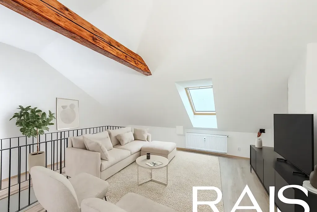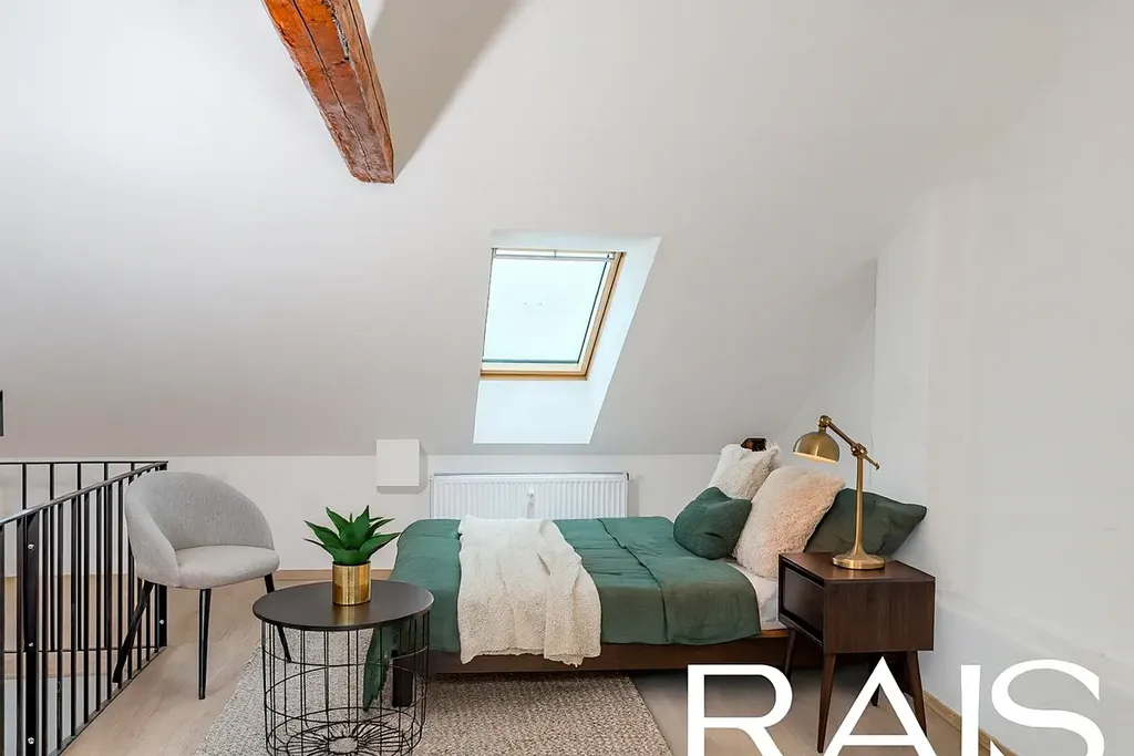 Byt o celkové výměře 63,3 m² je situován ve 3. a 4. nadzemním podlaží historického domu a jeho dvouúrovňové dispoziční řešení nabízí nejen praktické oddělení denní a noční části, ale také příjemný pocit vzdušnosti a otevřenosti, který je pro mezonetové byty tak charakteristický. Spodní úroveň o velikosti 21 m² tvoří elegantní obytný prostor s obývacím pokojem a koupelnou, jejíž moderní provedení, doplněné kvalitní sanitou a prvky značky Grohe, podtrhuje celkový nadčasový charakter interiéru. Horní úroveň o výměře 42,3 m² pak nabízí velkorysý prostor pro komfortní ložnici, doplněnou o knihovnu a klidovou zónu, která poskytuje ideální prostředí jak pro odpočinek, tak pro práci či studium, a zároveň umožňuje budoucímu majiteli upravit si prostor přesně podle vlastních potřeb.