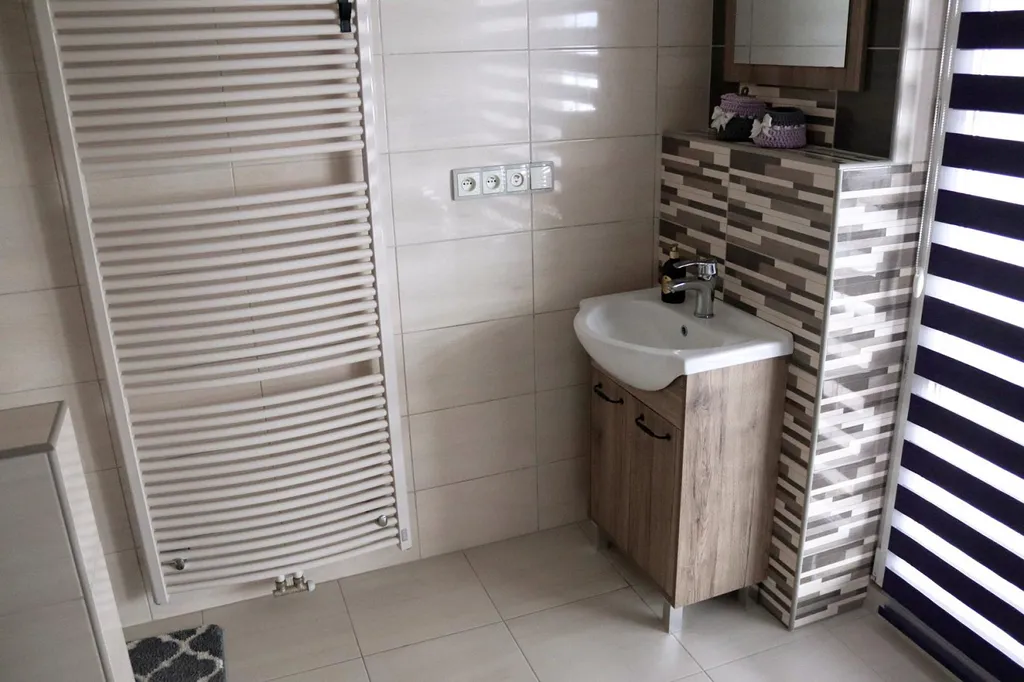 plnohodnotná koupelna se sprchovým koutem a toaletou