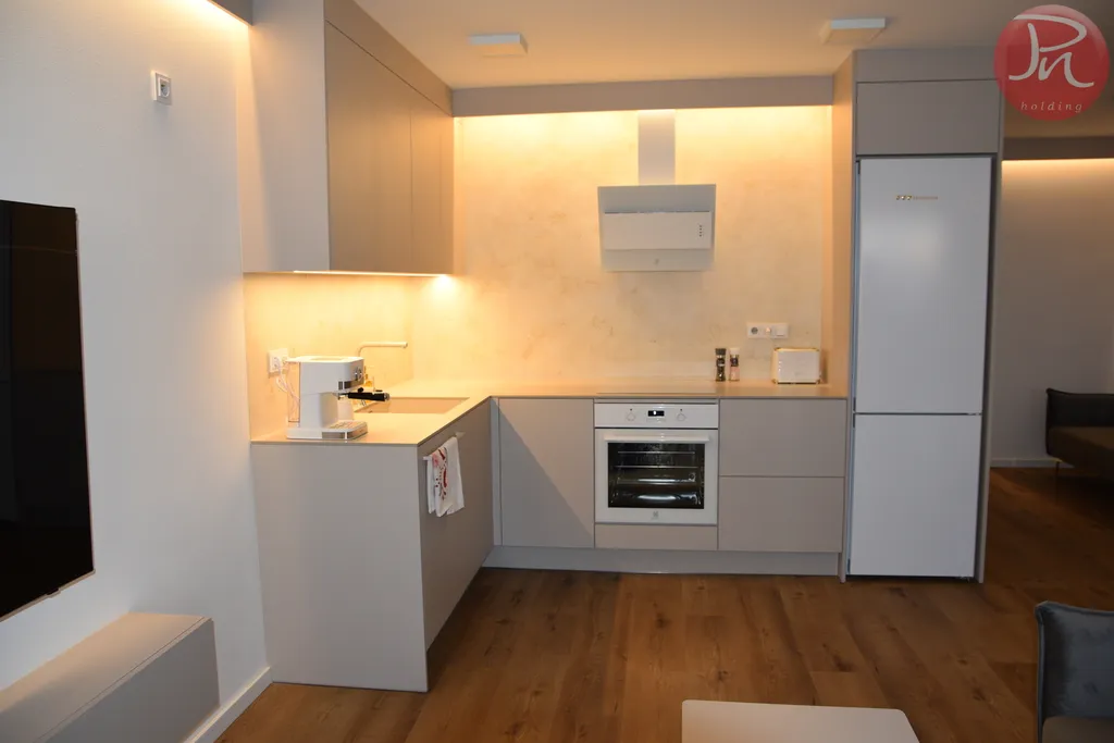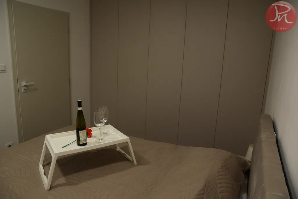 Interiér byl navržen s důrazem na kvalitu a harmonii. Moderní kuchyň je vybavena špičkovými spotřebiči, kompletním nádobím i praktickými detaily, které oceníte každý den. Obývací část působí vzdušně a elegantně, ložnice je oázou klidu. Byt je plně a nadstandardně vybaven – od nábytku přes textilie až po ložní prádlo. Nemusíte řešit stěhování nábytku, nákupy vybavení ani drobnosti do domácnosti. K nastěhování vám budou stačit pouze osobní věci. Vše ostatní už je připraveno.