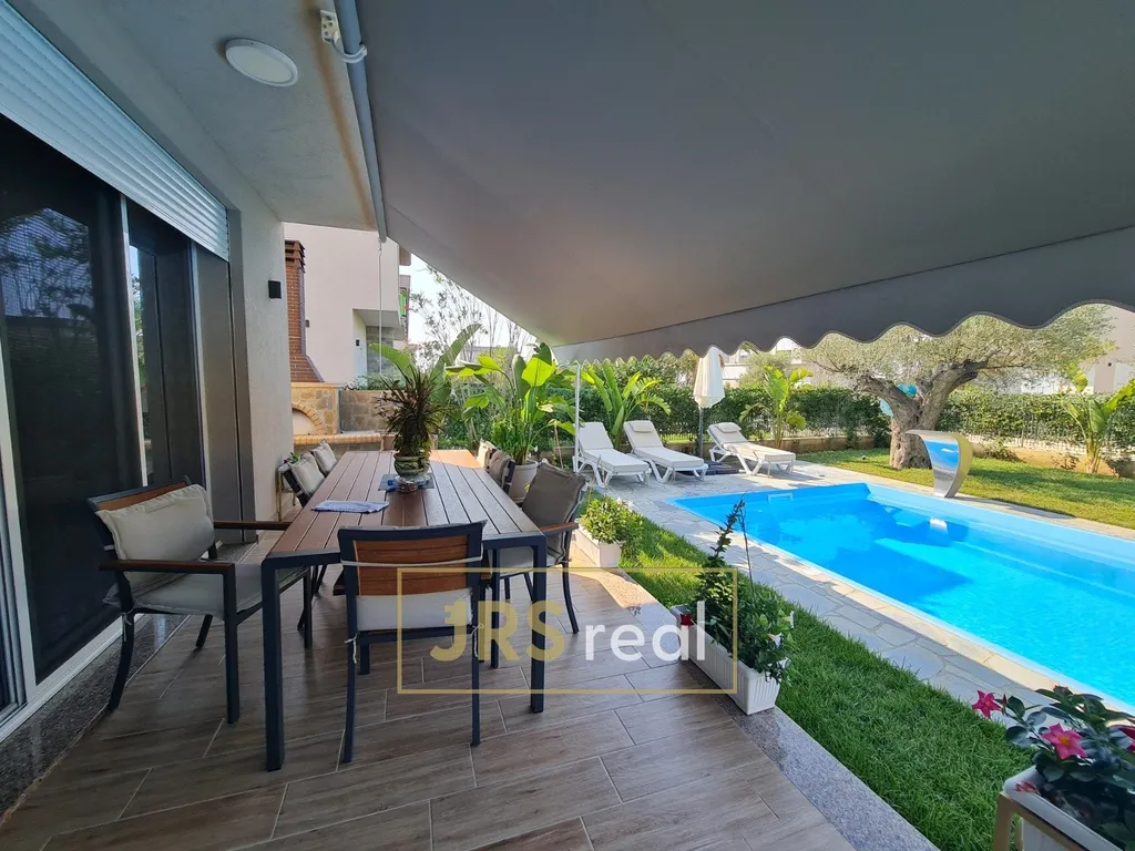 Před domem se nachází soukromý bazén a upravená zahrada, která přispívá k příjemnému rodinnému nebo dovolenkovému prostředí.