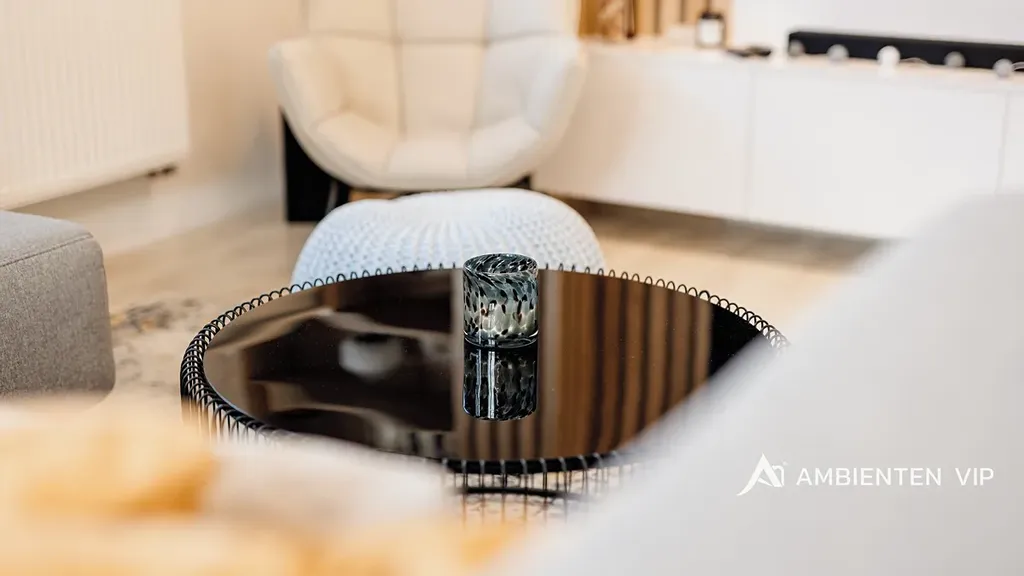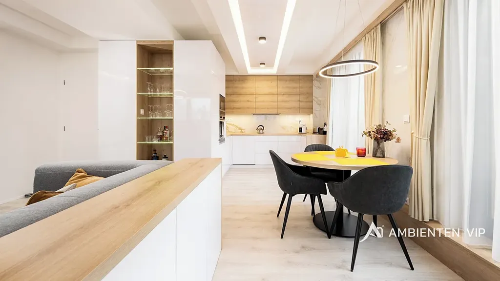 Interiér byl luxusně navržen studiem GALA Design s maximálním důrazem na komfort, funkčnost a nadčasovou estetiku. Dominantou bytu je obytný prostor o velikosti 35 m² s plně vybaveným kuchyňským koutem a spotřebiči Electrolux vyšší řady. Samozřejmostí je ambientní osvětlení, které v kombinaci s jihozápadní orientací zajišťuje dostatek přirozeného světla po celý den. Na západně orientovaných oknech jsou instalovány předokenní žaluzie. V bytě se nachází dvě klimatizační jednotky.