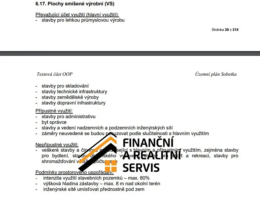 2 249 m2 plochy je územním plánem zahrnuto do "plochy smíšené výrobní". Je možné zde postavit stavbu pro lehkou průmyslovou výrobu, zemědělství skladování a podobně. Součástí prodeje je hotový projekt na plechovou výrobní halu o rozměrech 26,3 m x 15,7 m. Na pozemku byla schválena čistička odpadních vod.