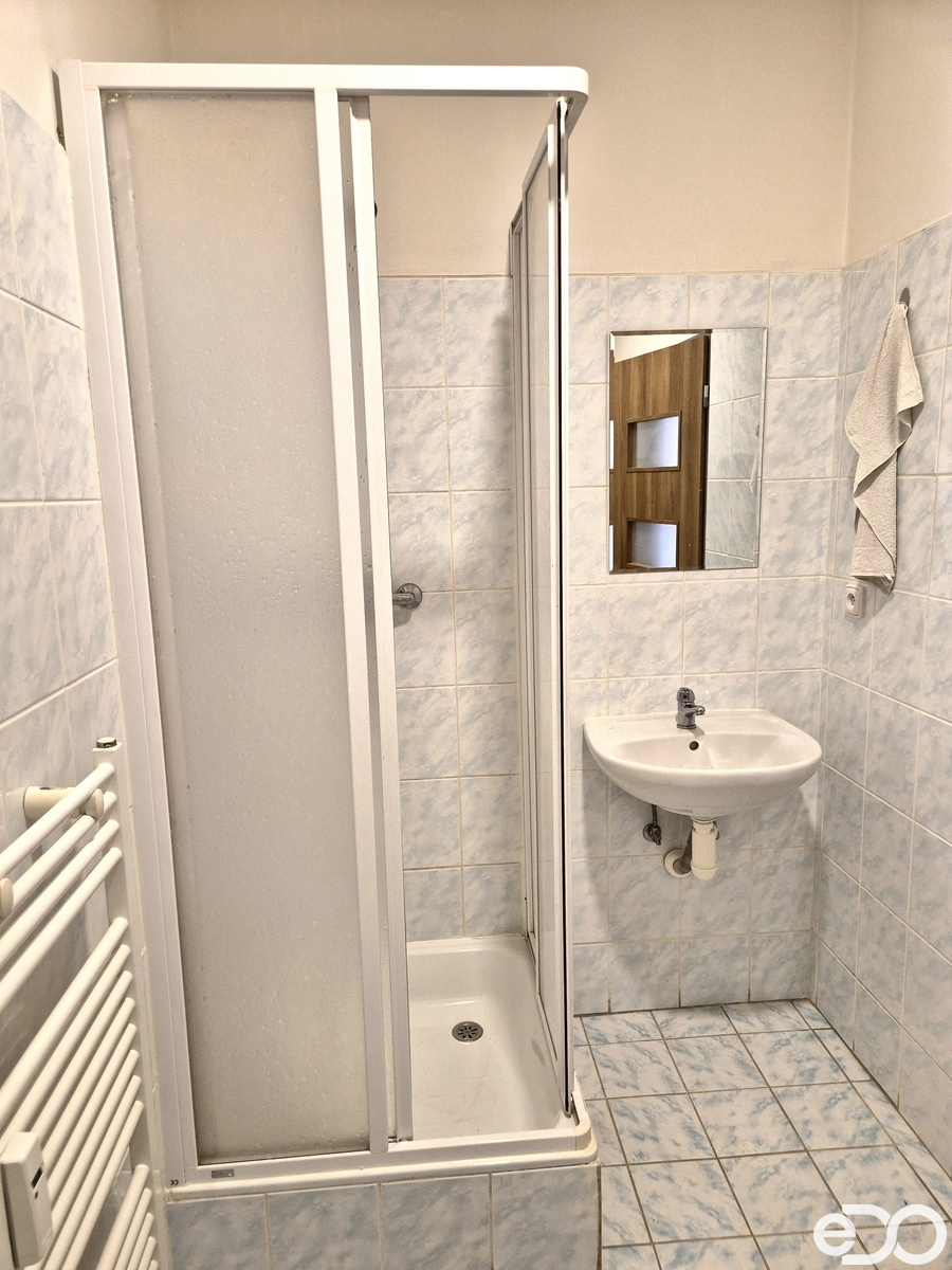 Interiér je udržovaný, čerstvě vymalovaný a připravený k okamžitému nastěhování. Obytný prostor s kuchyňským koutem je funkčně řešený a poskytuje dostatek místa pro každodenní život. Kuchyňská linka je vybavena elektrickým sporákem, troubou a digestoří s odtahem. Koupelna se sprchovým koutem je praktická a bez problémů pojme jak pračku, tak sušičku, toaleta je její součástí. Praktickým doplňkem bytu je místnost navíc, ideální pro menší šatnu, sklad nebo spíž. Byt je nabízen bez nábytku, což dává novému nájemci možnost zařídit si prostor přesně podle vlastních představ.