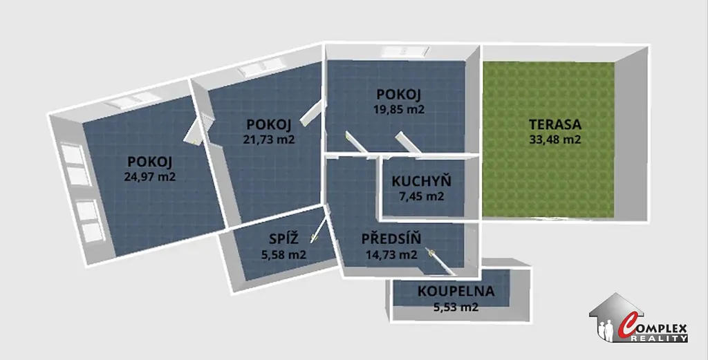 Tento byt nabízí k užívání prostornou předsíň, oddělenou kuchyni, spíž, obývací pokoj, 2 ložnice, toaletu, která je součástí koupelny - sprchový kout a prostornou terasu.