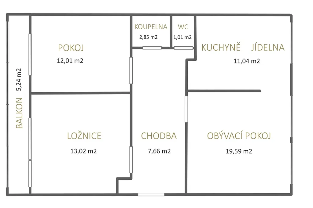 Tři samostatné pokoje: Neprůchozí pokoje o výměrách 19,59m², 13,02m² a 12,01m² zajišťují dostatek soukromí pro každého člena rodiny.