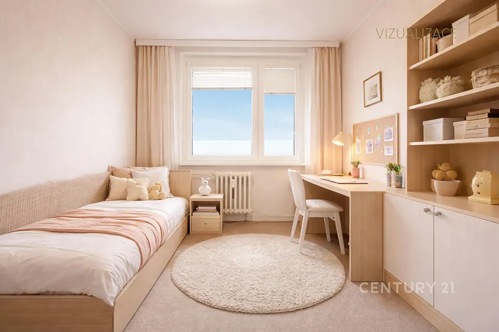 Potenciál další modernizace: Zatímco kuchyně je již hotová, zbytek bytu je v udržovaném původním stavu, což Vám dává svobodu dotvořit si koupelnu a pokoje podle svých představ. Pro inspiraci se podívejte na naše vizualizace.