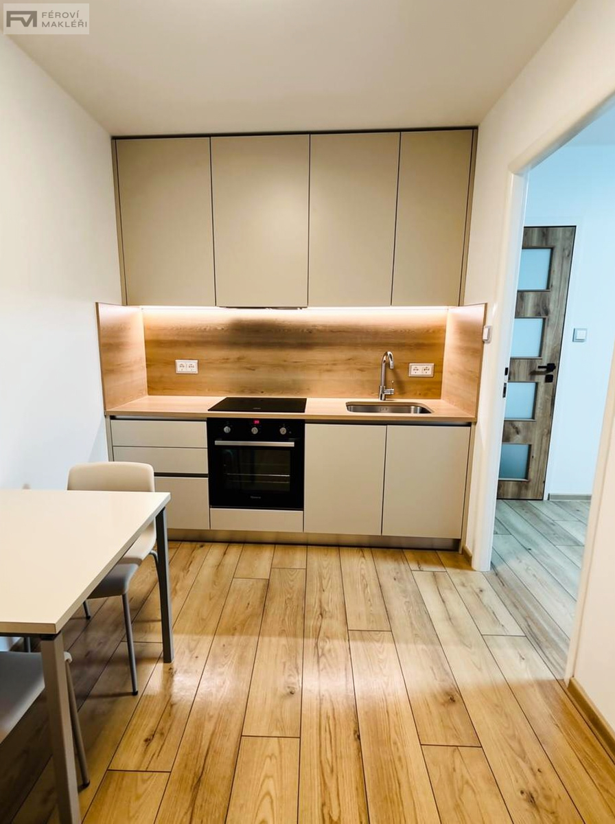 Nabízíme Vám k pronájmu bytovou jednotku o dispozici 1+1 a výměře 26 m2, umístěnou v 7. podlaží panelového domu ve vyhledávané lokalitě se spoustou zeleně a v blízkosti všech služeb města. Byt prošel zdařilou celkovou rekonstrukcí s akcentem na přírodní vzhled. Dispozice bytu jsou samostatná kuchyň a samostatný pokoj. z předsíně je vstup koupelny a WC. Okna bytu směřují na východ, takže je světlý, slunný a není v něm v létě horko. K bytu náleží sklepní kóje. Dům je udržovaný, má dva výtahy a do bytu je bezbariérový přístup z chodníku až do obýváku. V okolí domu je dostatek míst k parkování. Samotné umístění domu je v blízkosti základní občanské vybavenosti a výbornou dopravní dostupností. Byt je situován v příjemném místě s vyhlídkou na hory. Měsíční nájem 11000,- Kč, poplatky 712,- Kč, pojištění domácnosti 150, Kč, provize RK 11000,- Kč, vratná dvouměsíční kauce nebo pojištění nájmu 3500,- Kč/rok. Jelikož je tento byt je ještě voní novotou, neváhejte s prohlídkou, pokud chcete být první nájemníci.