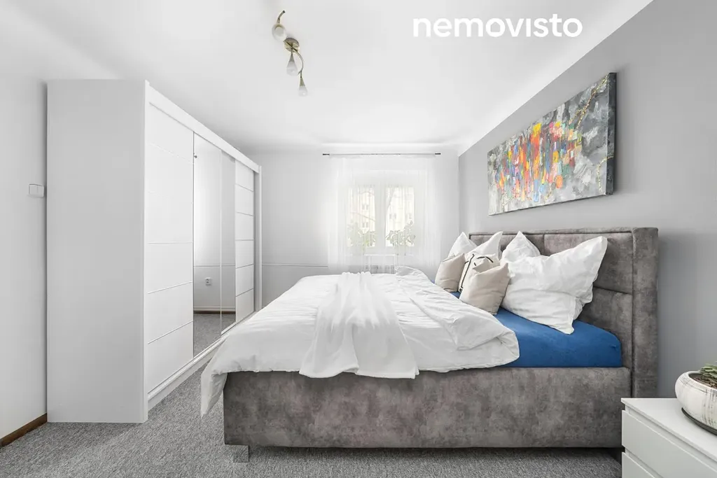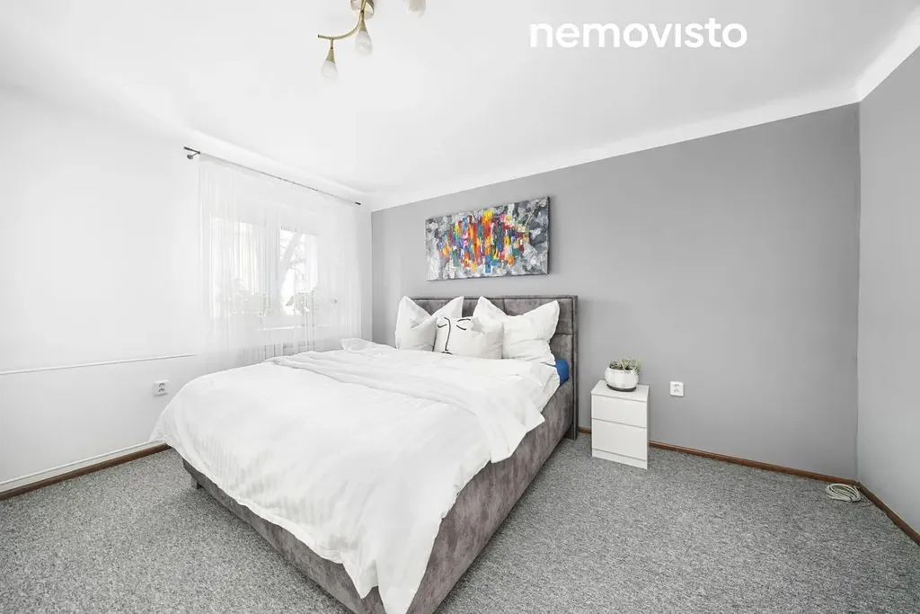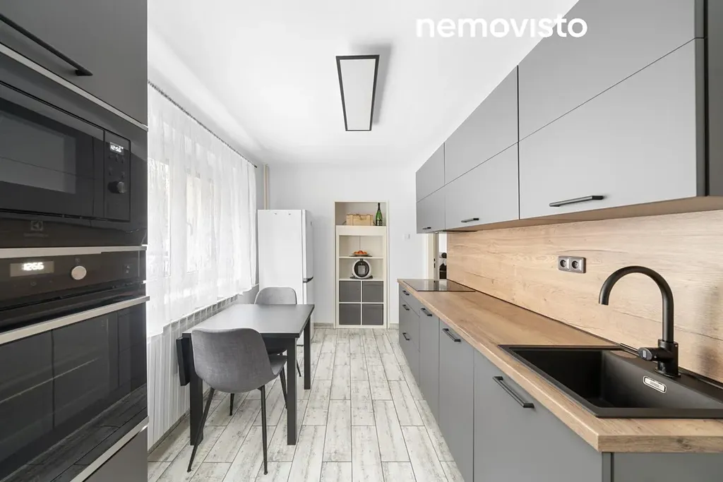 Byt má dispozici 2+1 je situován v 1.NP/3 cihlového domu po revitalizaci (zateplení, plastová okna). Byt zaujme moderní kuchyňskou linkou s vestavěnými spotřebiči (indukční deska, horkovzdušná trouba, mikrovlnka, myčka nádobí) a samostatně stojící lednice. Využít můžete praktickou spíž na potraviny. Ústřední chodba propojuje kuchyň, pokoje a sociální zázemí bytu. Velká koupelna disponuje vanou a prostorem pro pračku, potěší okno pro dostatek denního světla. Toaleta je samostatná. Dále se chodbou dostaneme do obývací pokoje se sedačkou a televizní stěnou, na kterou navazuje vstup do ložnice. Díky velikosti nebyl problém umístit dvě velké šatní skříně a manželskou postel. Byt je určen k okamžitému bydlení bez nutných investic.