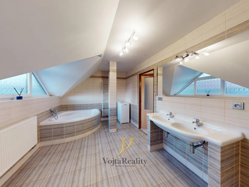 V horním patře jsou situovány čtyři samostatné neprůchozí pokoje, které lze využít jako ložnice, dětské pokoje či pracovnu. Komfortní zázemí doplňuje velká koupelna s vanou, sprchovým koutem a dvěma umyvadly, doplněná o další samostatné WC. Pro uložení sezónních věcí slouží zateplený půdní prostor přístupný nad obytnou částí.
